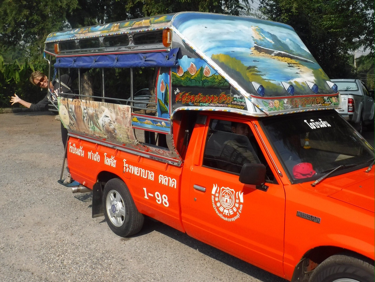 Terri jumping into a Songthaew, taxi in Kanchanaburi