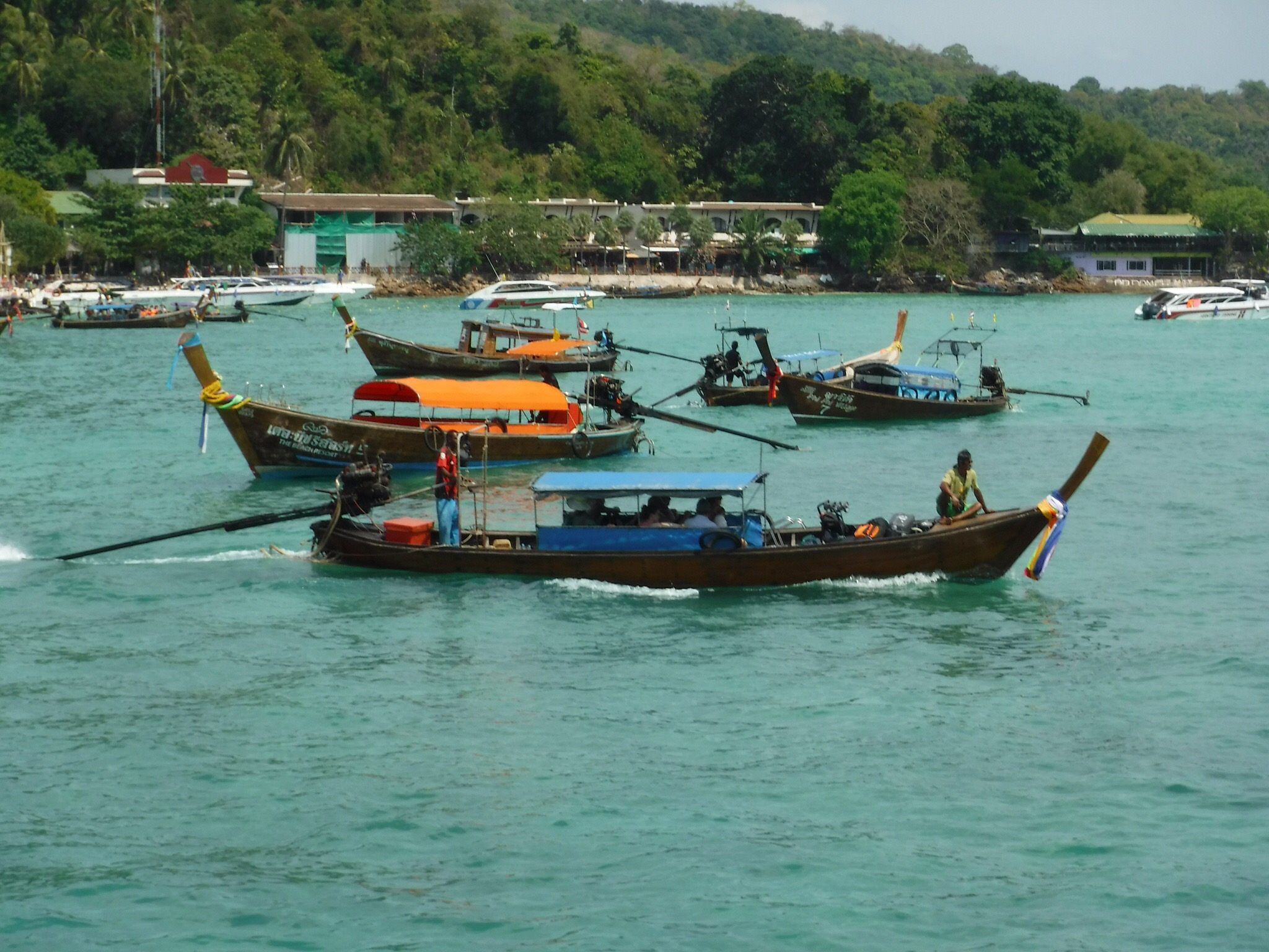 Koh Lanta is a great island with beautiful beaches. We stayed at the Relax Bay Resort which many people would consider a misnomer (the resort part). It has about 30 individual bungalows set among palm trees and ponds and is at the water’s edge. It’s best aspect is the beach itself, a crescent shaped white sand beach with a few colorful fishing boats scattered along the shore. The bungalows themselves are quirky to say the least but the idea is to not be in them! I believe, in Thailand, to be considered a “resort” the facility must provide indoor plumbing, Check! The Relax Bay Resort qualifies! The resort also provides covered cabanas for the early risers (thats us!) along with a nice restaurant and bar if you get hungry or thirsty. A short walk along the beach offers additional opportunities for libations, nourishment and massage. We really did enjoy our stay here and would eagerly stay here again if the opportunity arose.
