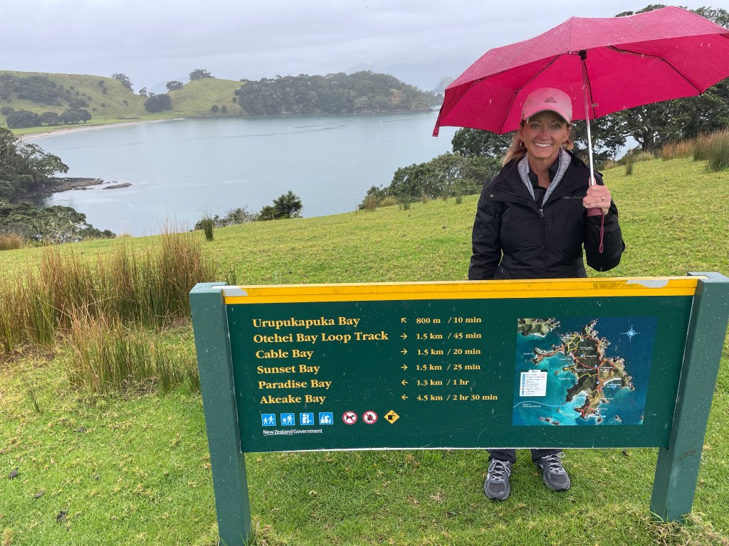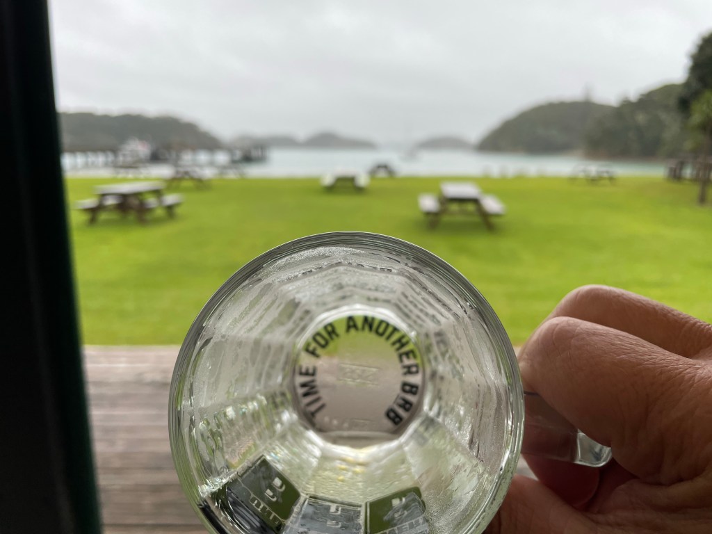 The return trip affords a stop at one of the larger islands, (Urupukapuka Island), where people are allowed to hike and camp. Terri and I went for a hike in the rain while everyone else went to the tavern on the beach.