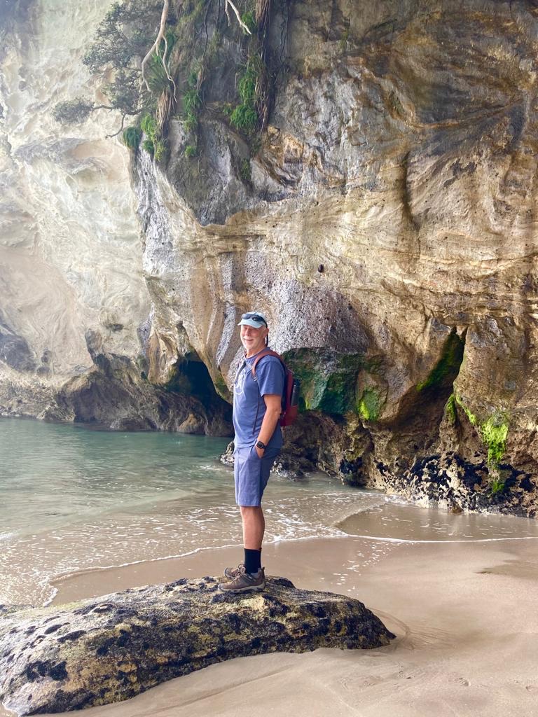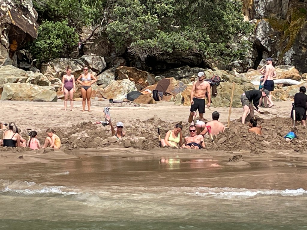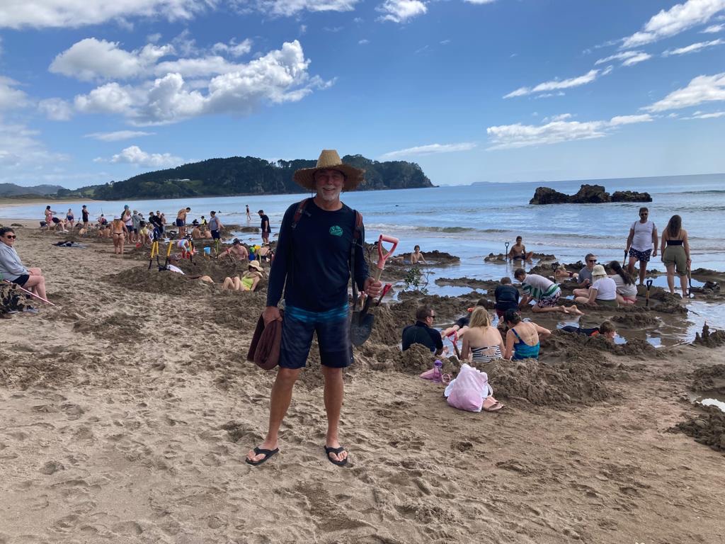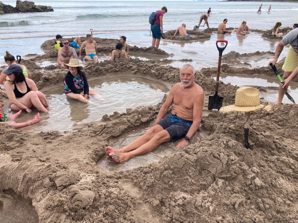 After breakfast we rented a shovel from the campground and headed for Hot Water Beach. Here you can dig in the sand within two hours of low tide, make a hole or “sand hot tub” and watch it fill with hot water. Sometimes, very hot water! That is, if you can find the space to dig a hole, not cave-in someone else’s sand tub, (oops-sorry!), and not burn your feet in the process.